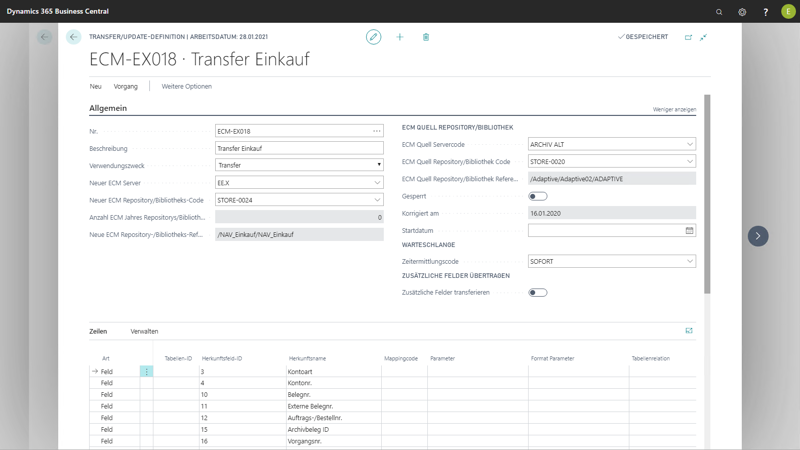 ECM Quell Server Code | Die Felder werden nur für die Inforegister "Allgemein" 1#Zeilen der Transferdefinitionen benötigt, um die zu transferierenden Metadatenfelder der Quellbibliothek / Ablage auswählen zu können. |