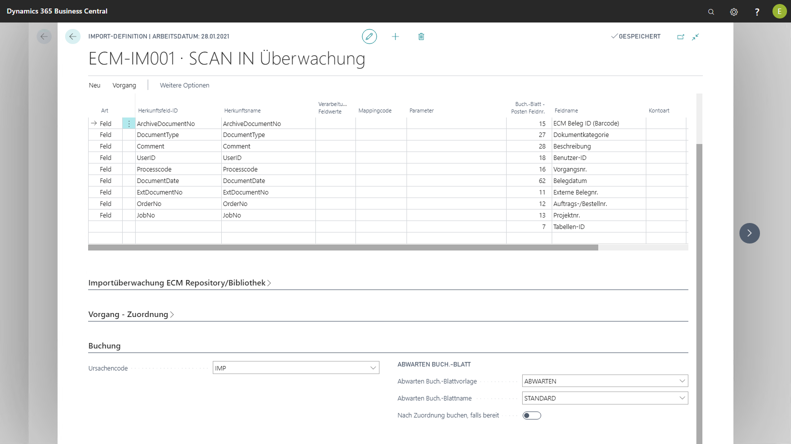 Alle anderen Felder des Inforegisters Buchung der Import-Dokumentdefinitionen stimmen funktional mit denen der Dokumentdefinitionen überein.