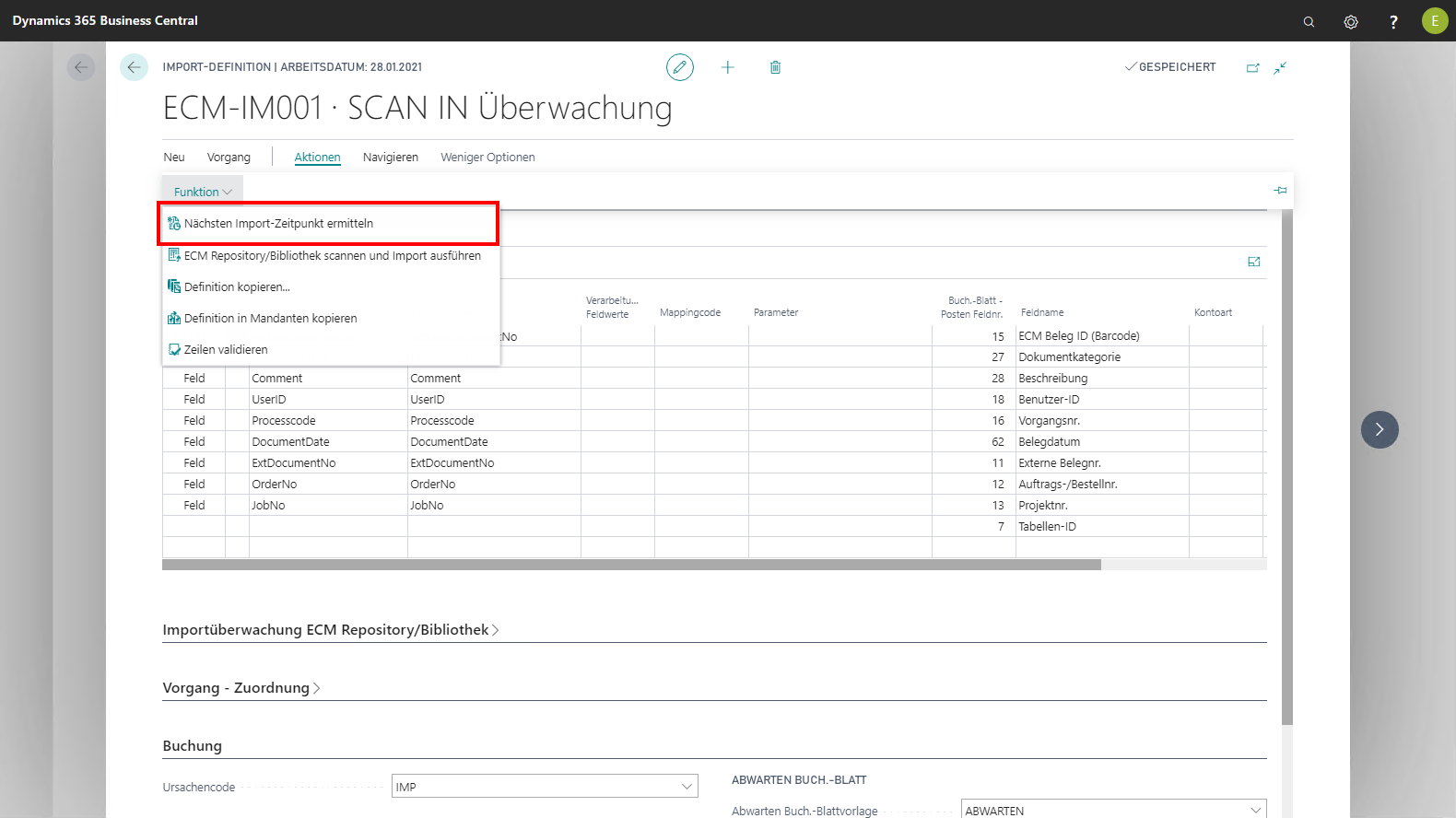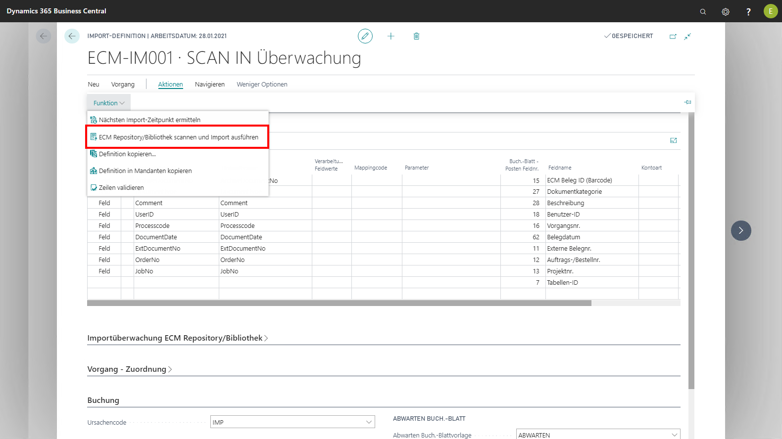 Standardmäßig wird die Importüberwachung vom ECM-Aufgabenplaner automatisch ausgeführt, wenn dieser entsprechend eingerichtet ist. Zu Testzwecken oder wenn kein NAS-Server eingesetzt werden kann oder soll, lässt sich der Import manuell über die Aktion Bibliothek / Ablage scannen und Import ausführen im Menüband gestartet werden. Auf der Page 51 Einkaufsrechnung ist die Aktion Bibliothek/Ablage scannen und Import ausführen als Muster implementiert, über die der Import unabhängig vom NAS-Server und der Zeitermittlung direkt ausgeführt werden kann.