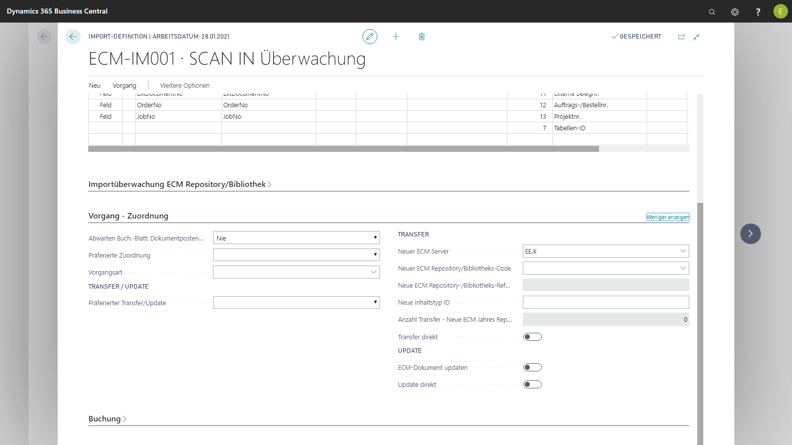 Standardmäßig werden für die Zuordnung von importierten Belegen zu Microsoft Dynamics 365 Business Central-Vorgängen die Einträge der Import-Dokumentdefinition verwendet. Für die Zuordnung von Vorgängen zu exportierten Belegen wird die entsprechende Dokumentdefinition herangezogen. Dies gilt auch für die Überprüfung der jeweiligen Pflichtfelder.