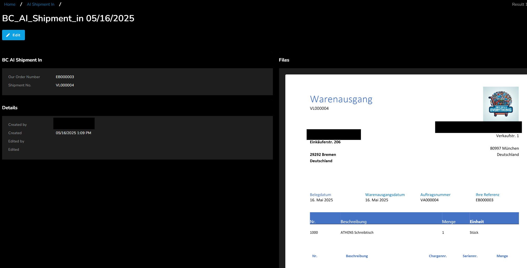 Der neue Lieferschein wird im Type in DM angelegt (z. B. Mail Fetcher) und wird extrahiert per KI unsere Bestellnr.: