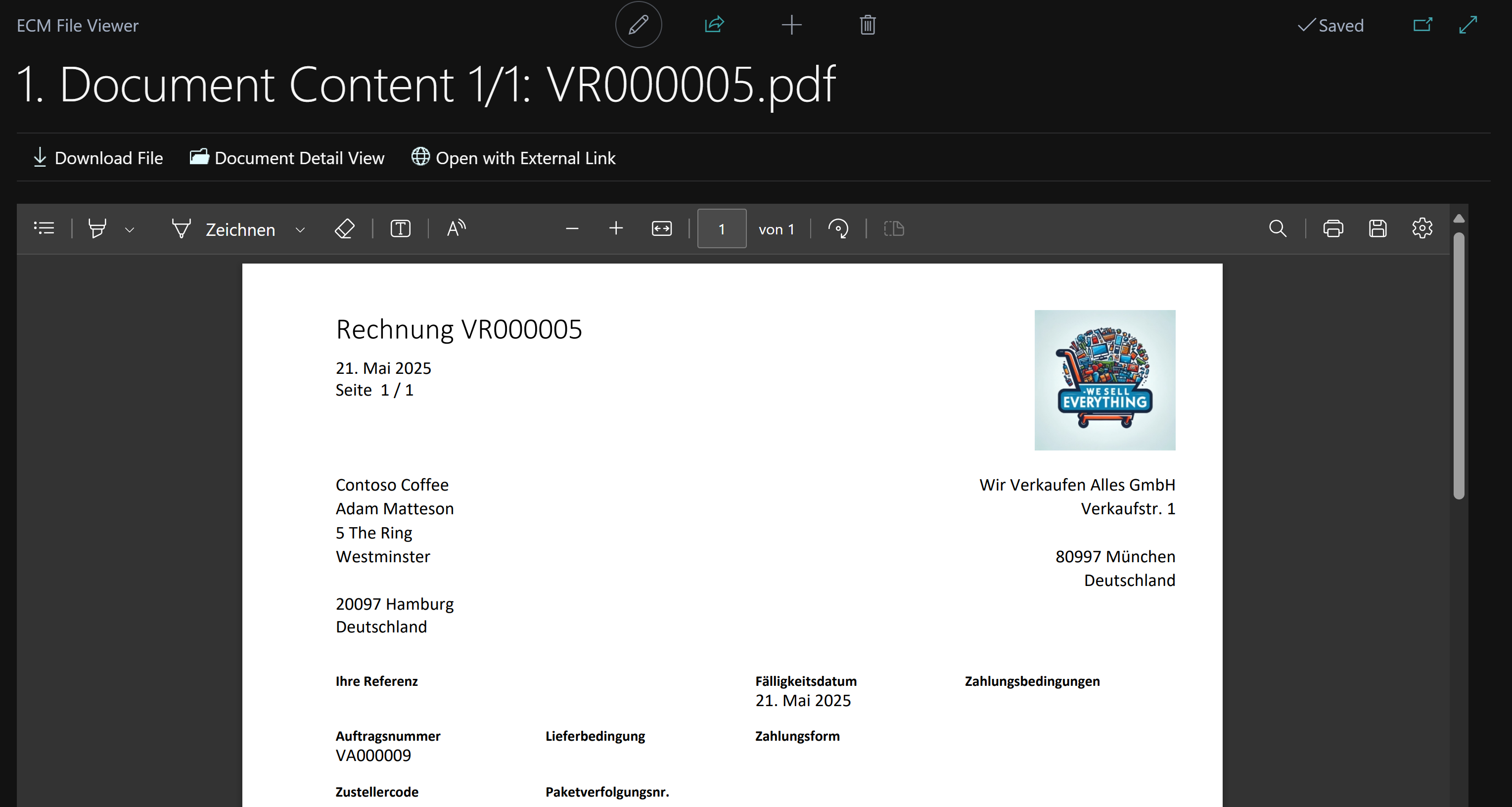 Ist die Dateiendung des Dokuments im “ECM Benutzer” in der Dateierweiterung Dateibetrachter hinterlegt, können Sie es im integrierten Viewer anzeigen (falls vom Browser unterstützt):