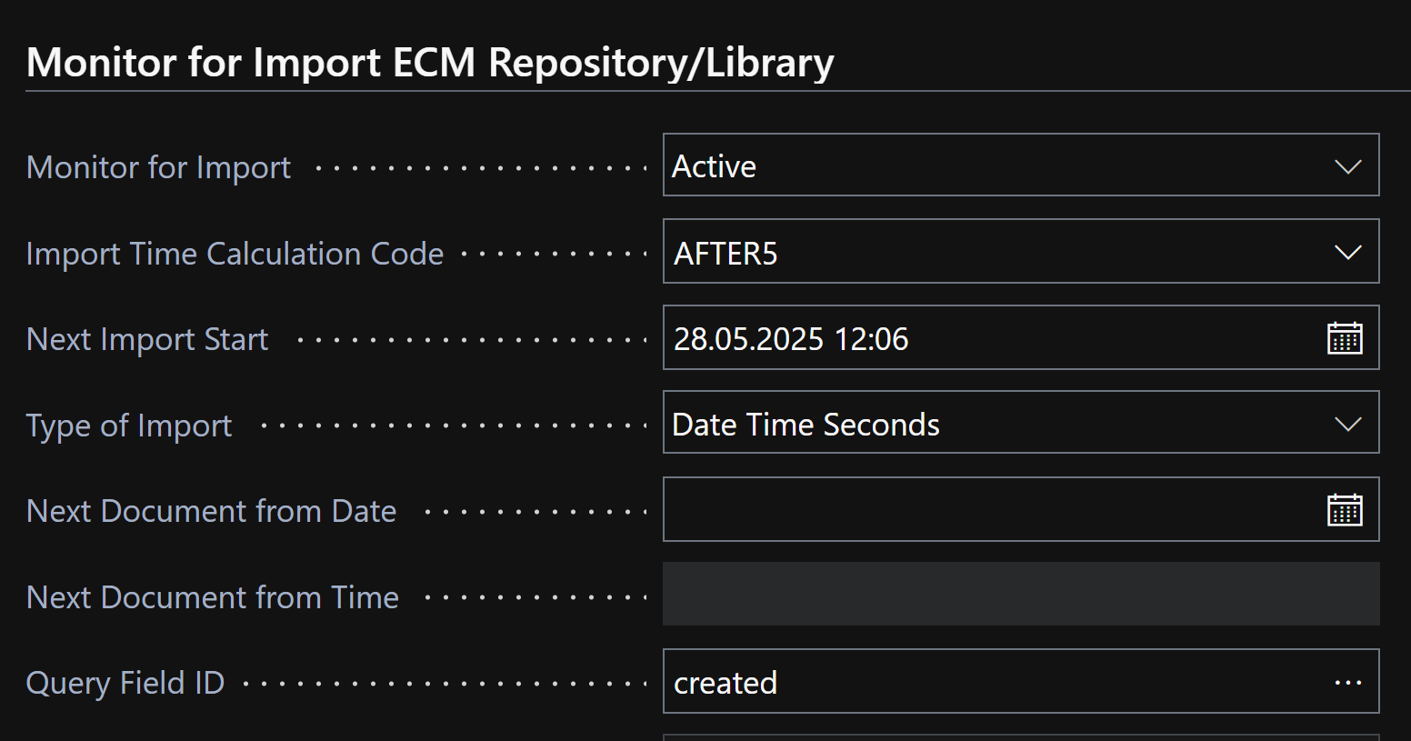 Außerdem muss definiert werden, wie BC neue Dokumente findet. Für DM ist dies derzeit nur anhand von “Datum/Uhrzeit Sekunden” möglich. Wir definieren außerdem, dass der Import alle 5 Minuten erfolgen soll:
