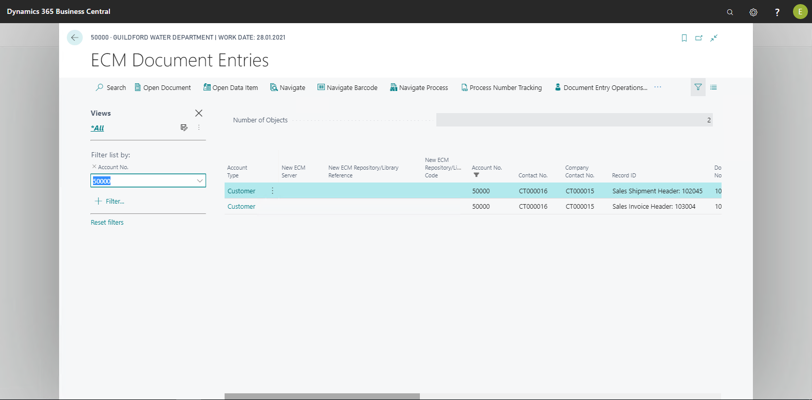 Alternatively, archived documents for receipts and postings are listed in Microsoft Dynamics 365 Business Central using the Navigate function. From here, it branches, among others, to the document entries page from which you can open the archived documents. Moreover, you can find a menu item of the document entries via Departments > EASY / SharePoint ECM > Search > Document Entries.