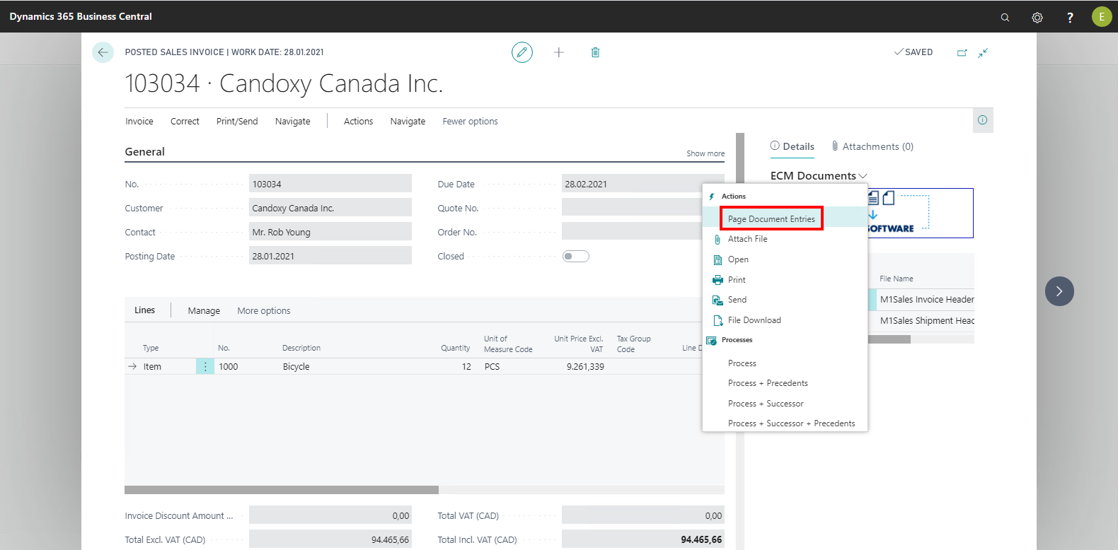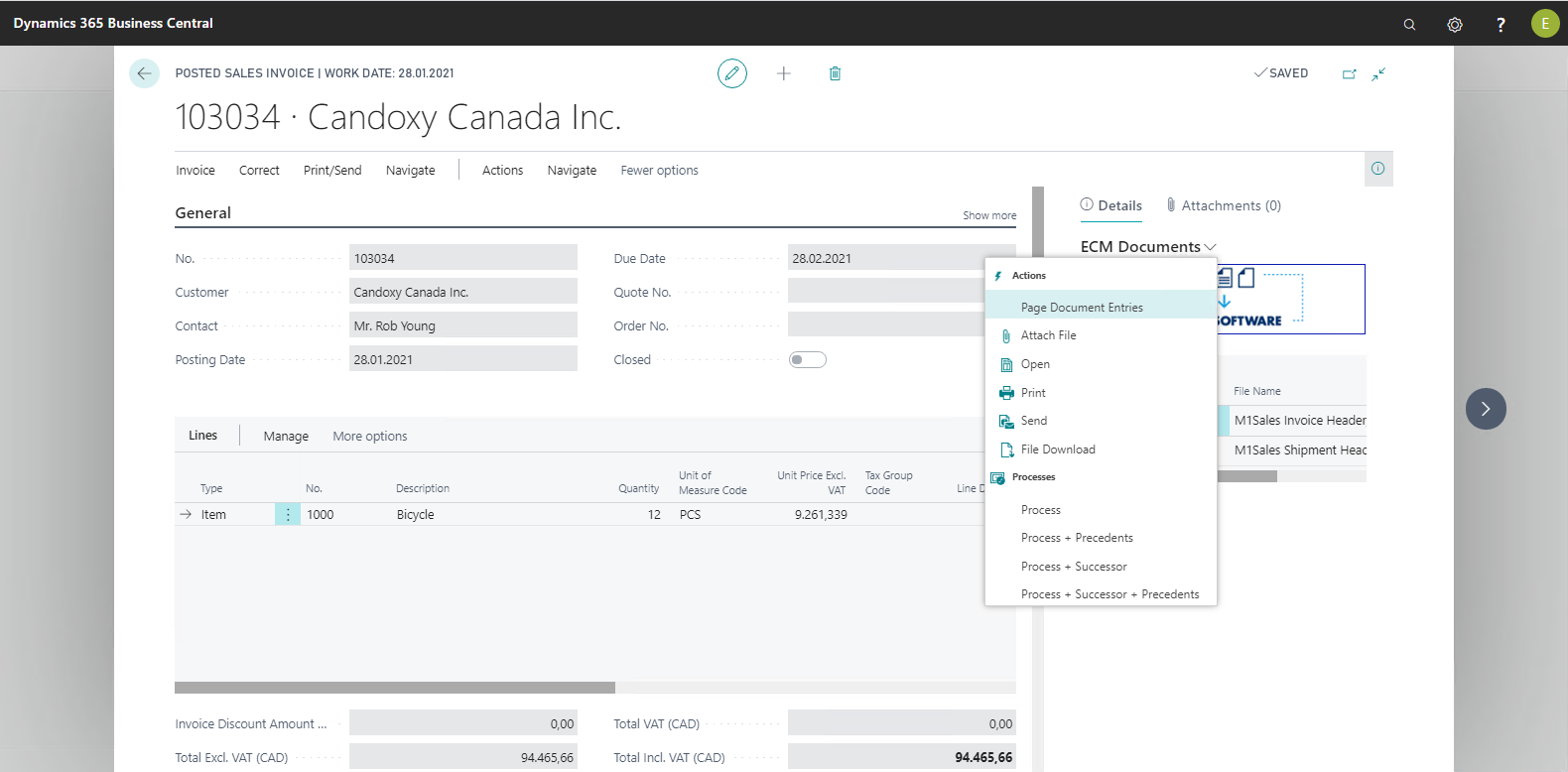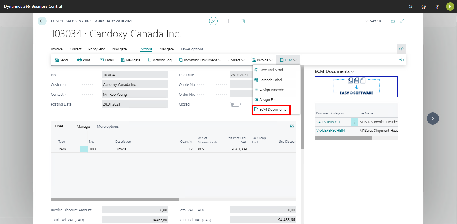 Once the ECM documents FactBox in the 365 BC client pops up (the prerequisite for this is installing the add-in), you can open and view the documents listed in the FactBox by double-clicking.