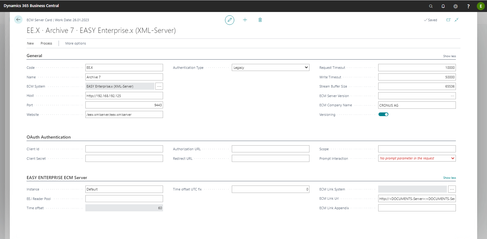 The setup item ECM Server includes all relevant data for establishing the information transfer between an ECM system and Microsoft Dynamics 365 Business Central.