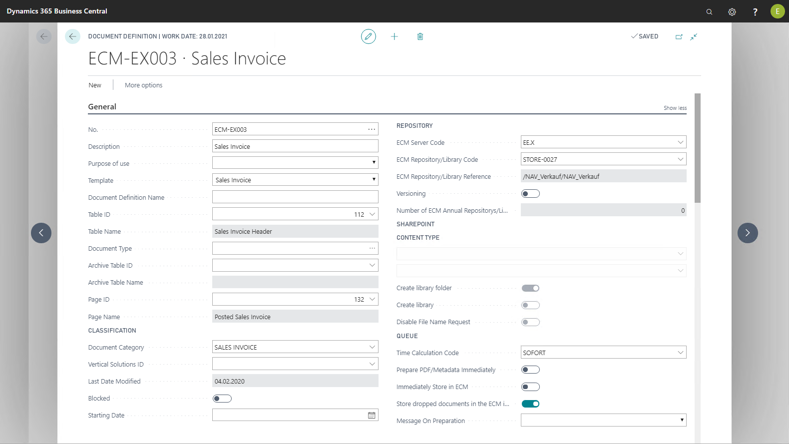 Immediately store in ECM | If this option is enabled, the metadata will be written to a temporary table according to document definition immediately after printing or posting the document. At the same time, a PDF file is created, stored temporarily on the server hard disk, and then immediately archived by the client. |