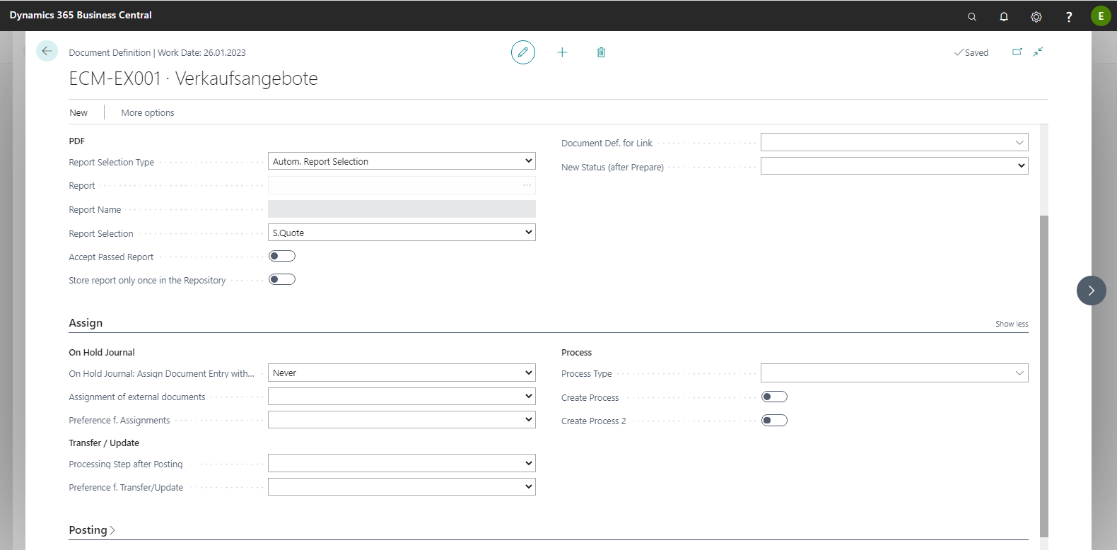 *The fields in the Transfer section refer to transfer functionality; they are dynamically shown or hidden, depending on whether the value "Transfer" or "Transfer directly without document entry" in the "Processing step after posting" field is set.