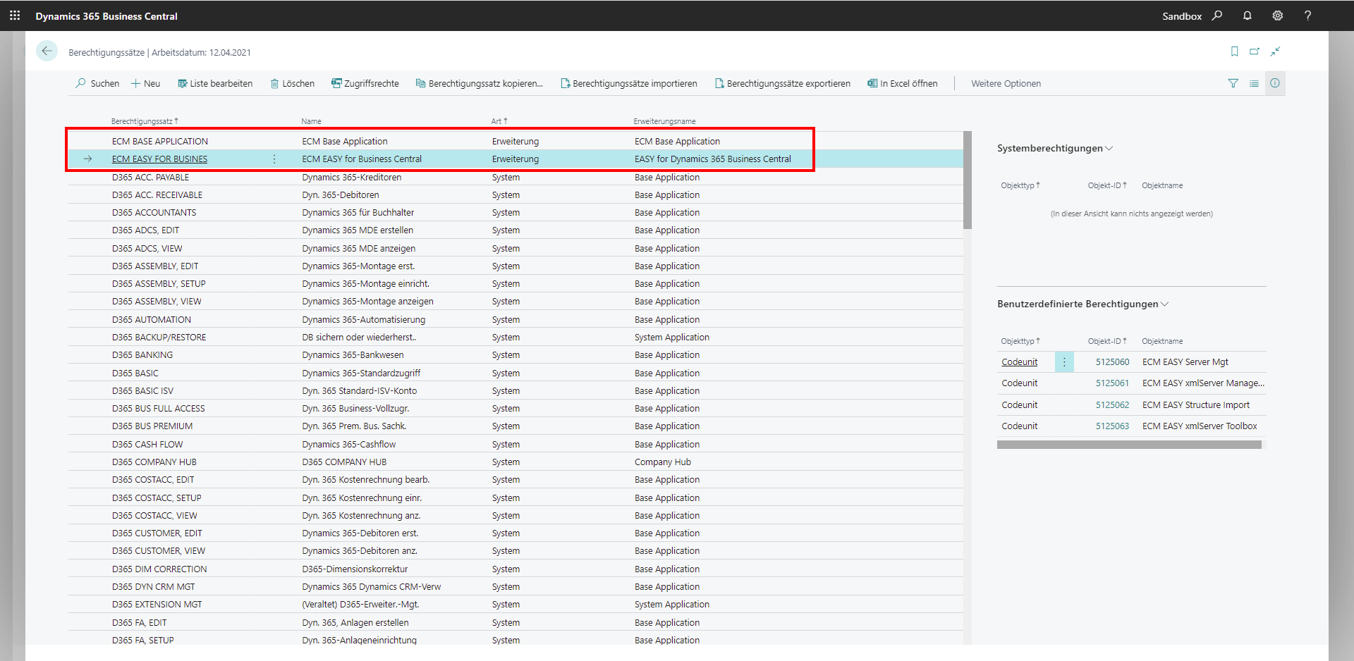 Documentation Administrator Documentation Installation ECM Permission Sets ECM Permission Sets With the installation of the app, the permission set "ECM BASE APPLICATION" is added.Posting is not possible without the relevant permissions. More info can be found here: https://docs.microsoft.com/de-de/dynamics365/business-central/ui-define-granular-permissions EASY DM Setup Assistant Configuration