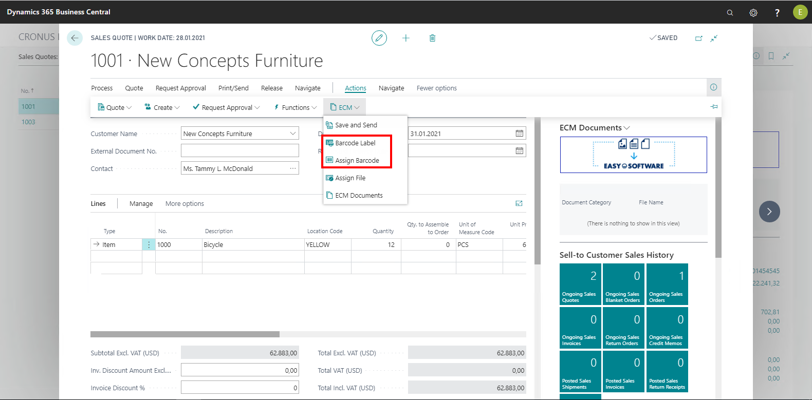 The ECM actionAssign barcode allows you to manually link, for example, a previously scanned document with the associated record in Microsoft Dynamics 365 Business Central. Moreover, you can enter a corresponding description.
