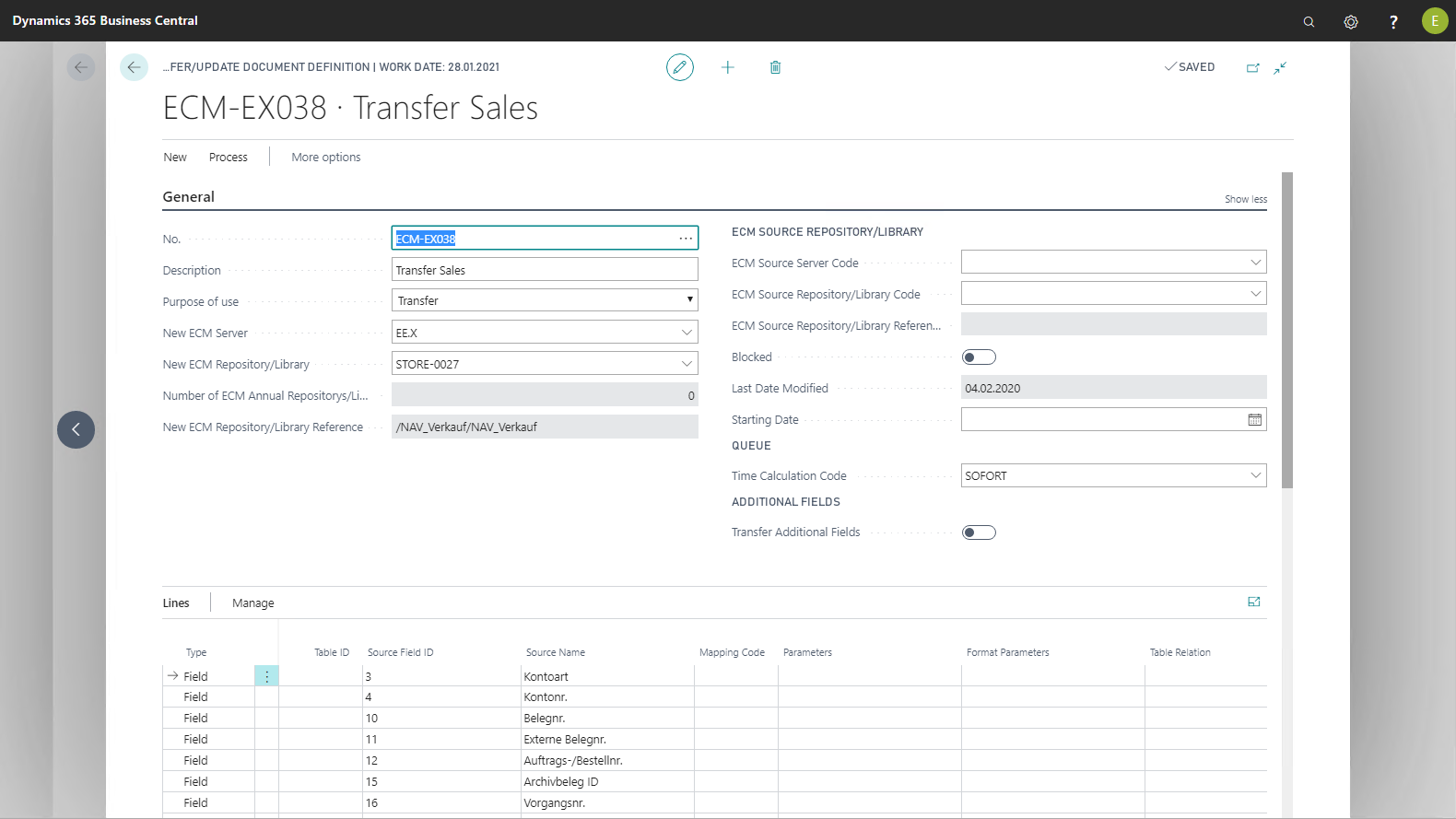 If other tables (Table no. field) with table relation to the master table Document journal line are defined in transfer definition lines, you can pass other field data from Microsoft Dynamics 365 Business Central to the new ECM library/storage. To do this, you need to enable the Transfer Additional Fields option. The prerequisite is that the record linked with the document entry still exists in Microsoft Dynamics 365 Business Central.