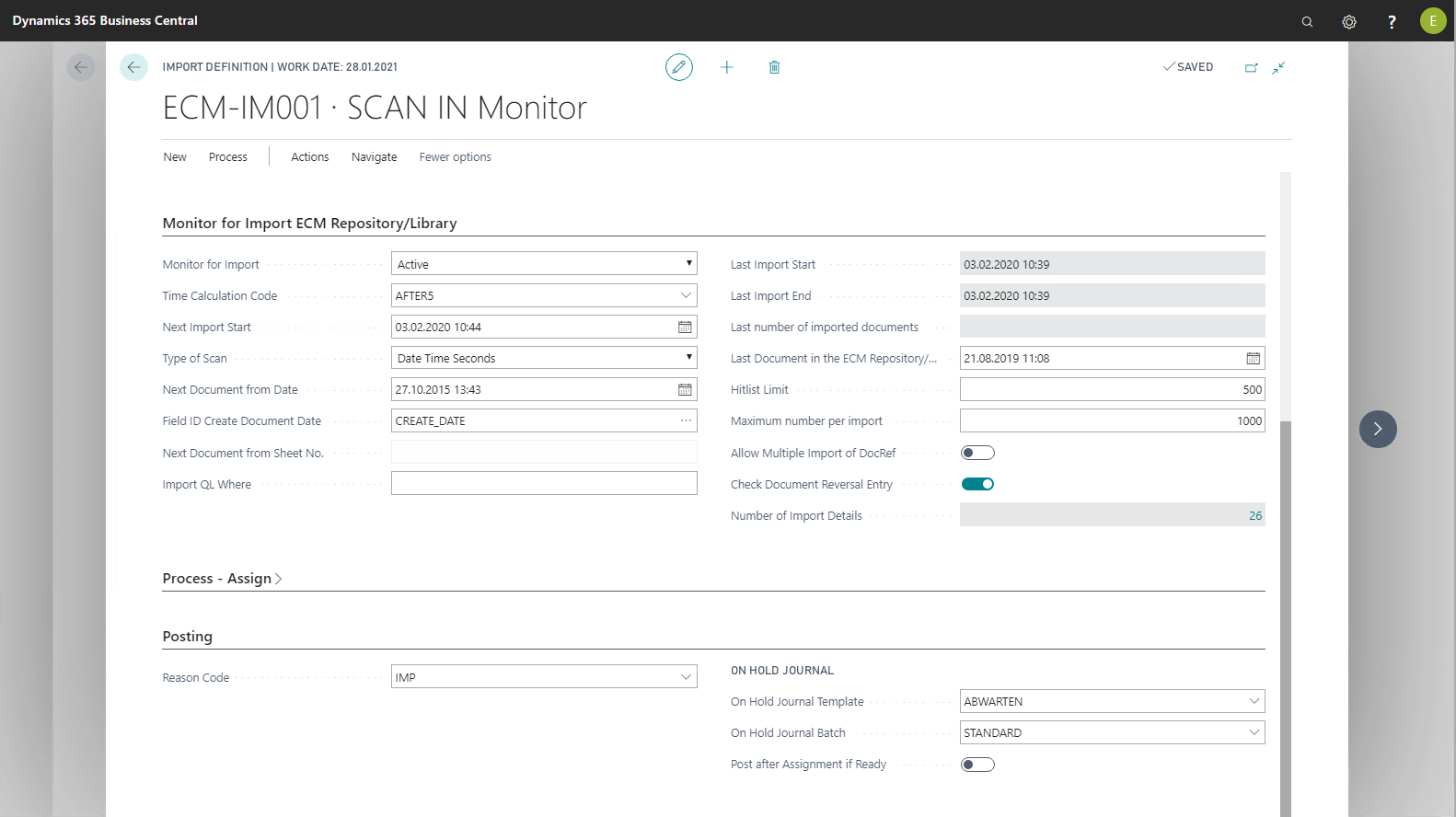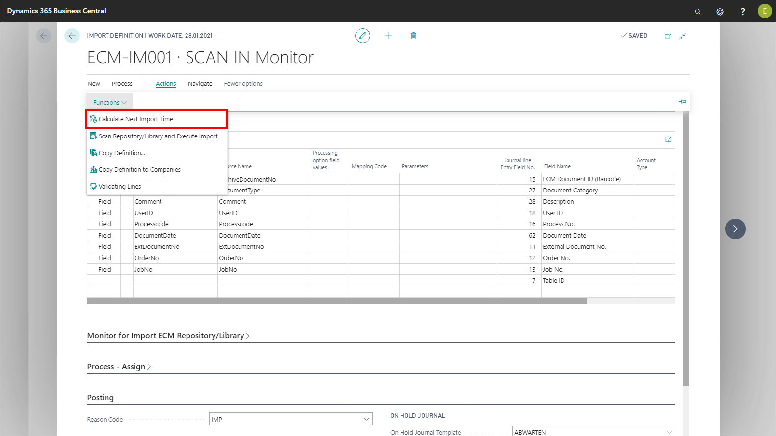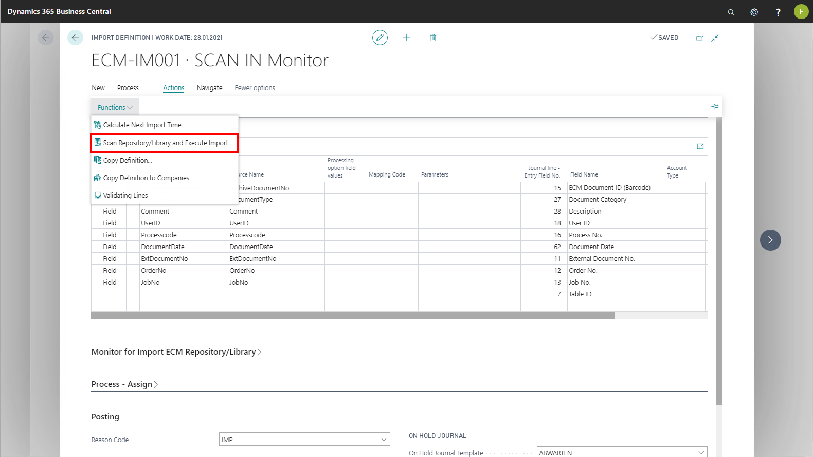 By default, if set up accordingly, an ECM Job Queue Entry automatically executes the Monitor for Import function. For testing purposes or if you cannot or do not want to use an NAS server, import can be started manually via the Scan Library/Storage and Execute Import action on the menu ribbon. On page 51 Purchase invoice, the Scan Library/Storage and Execute Import action is implemented as a sample. It allows direct execution of import regardless of the NAS server and time calculation.