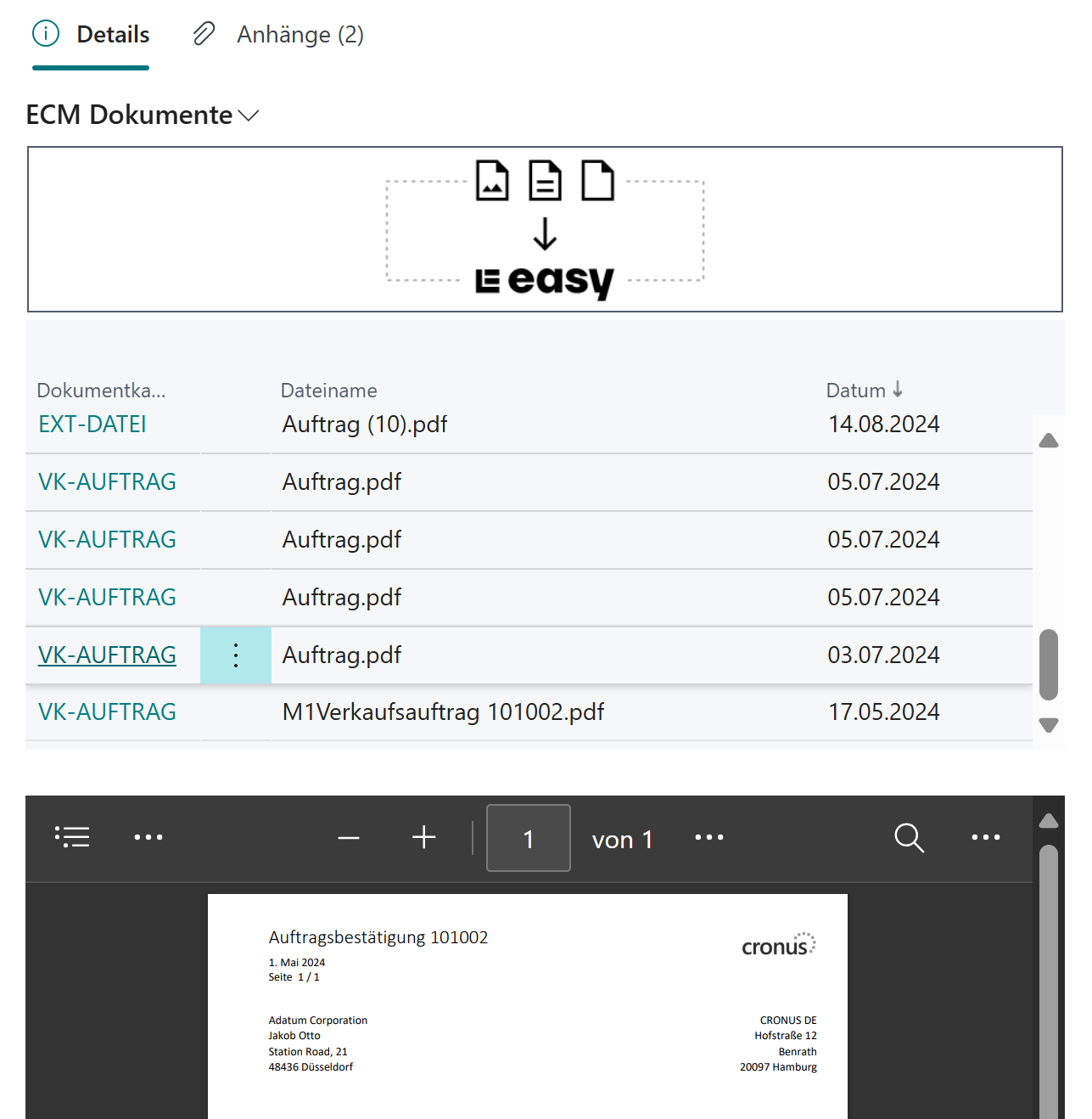 Once the ECM documents FactBox in the 365 BC client pops up (the prerequisite for this is installing the add-in), you can open and view the documents listed in the FactBox by double-clicking.