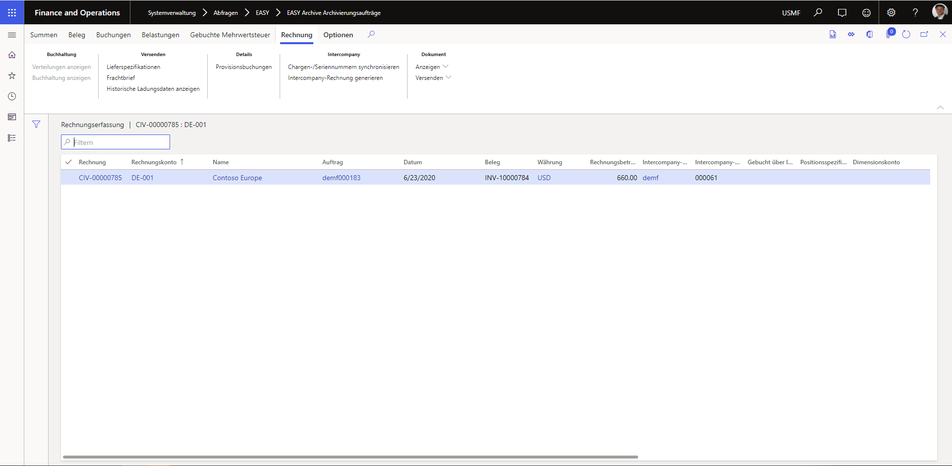 Diese Aktion öffnet den verbundenen Dynamics 365 FO-Datensatz des ausgewählten Beleges, beispielsweise eine Debitorenrechnung: