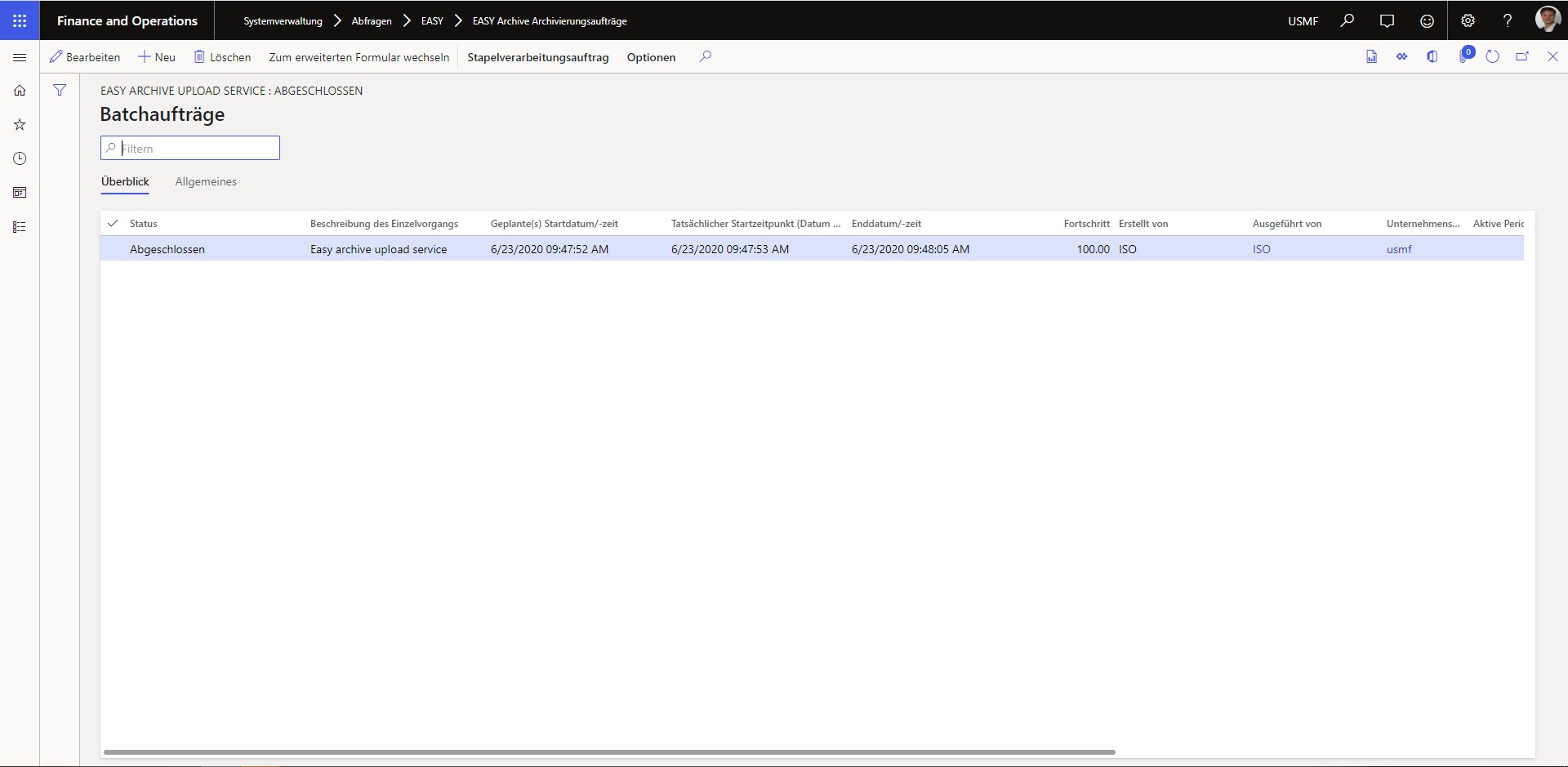 Diese Seite zeigt den Stapelverarbeitungsauftrag, der den Archivierungsauftrag ausführt oder ausgeführt hat, und dessen aktuellen Status.
