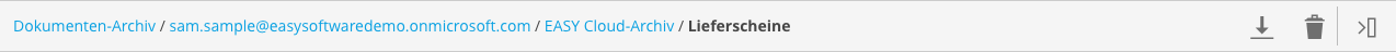 In der Funktionsleiste kann über die Brotkrumennavigation der Wechsel zwischen den Ordnern des im Navigationsbereich aktuell ausgewählten Archivs erfolgen. Darüber hinaus werden hier nach Auswahl einer oder mehrerer Ordner/Dokumente in der Trefferliste die Funktionen zum Herunterladen und Löschen eingeblendet. Über das Pfeil-Symbol am rechten Rand lässt sich die Vorschau ein-/ausblenden.