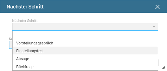 Der Workflow-Schritt Absage steht als jeweils nächster Schritt sowohl nach der Sichtung als auch im Anschluss an Einstellungstest und Vorstellungsgespräch im Dialog zur Auswahl.