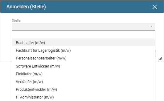 Für die Seminaranmeldung stehen unterschiedliche Möglichkeiten zur Verfügung. Die Anmeldung kann entweder personenspezifisch erfolgen oder bezogen auf eine Stelle, eine Funktion oder eine Organisationseinheit. In diesem Fall werden alle der jeweiligen Stelle, Funktion oder Organisationseinheit zugeordneten Mitarbeiter für das Seminar angemeldet. Durch Auswahl einer Anmeldefunktion im Aktionen-Menü wird der jeweils entsprechende Dialog geöffnet, in dem sich beispielsweise die anzumeldenden Stelle auswählen lässt.