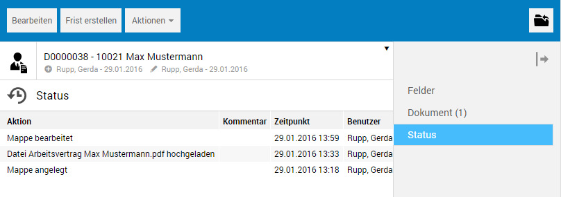Edit mode automatically terminates when saving, and you are taken to view mode. Moreover, a corresponding entry is created for the new file in list view. The file's title is composed of a number automatically generated in the Number field, the number assigned in the personnel file, as well as the employee's first and last name, e.g. D0000038 - 10021 Sam Sample.